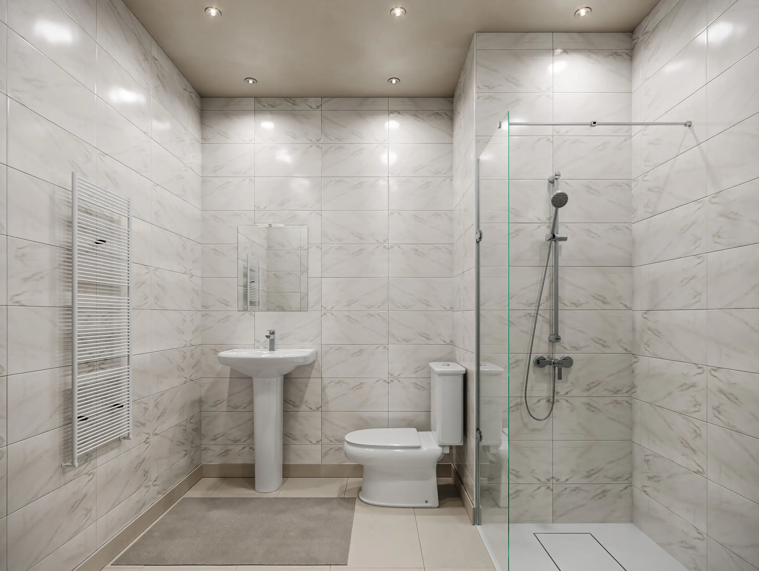 Les finitions reflètent le niveau de standing du programme : carrelage grand format, robinetterie chromée et espaces de rangement optimisés.